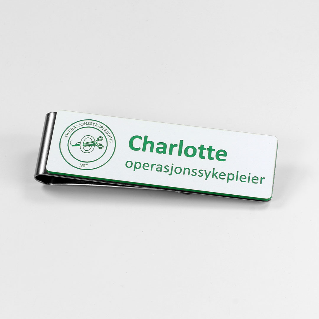 Navneskilt som tilbys i samarbeid med Faggruppa Operasjonssykepleierne. Skiltet har den praktiske og populære metallklypen som er optimal for en operasjonssykepleiers hektiske hverdag - sitter godt og er enkel å ta av / på.