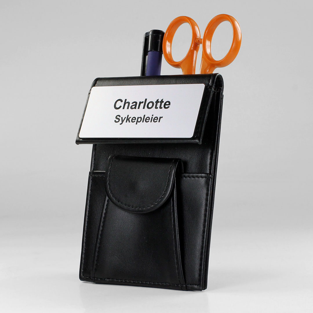 Den klassiske skiltmappen i imitert skinn, med navneskilt og lomme for penner og saks. Tidligere solgt gjennom Gymo har denne skinnmappen i mange år vært særdeles populær hos sykepleiere og helsefagarbeidere landet over. Leveres ferdig med navneskilt som lages med valgfri tekst og eventuelt grafikksymbol. Rask levering, kun 1-2 dager + postgang.